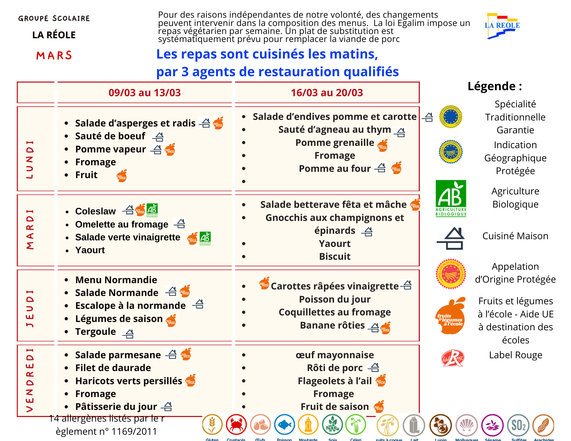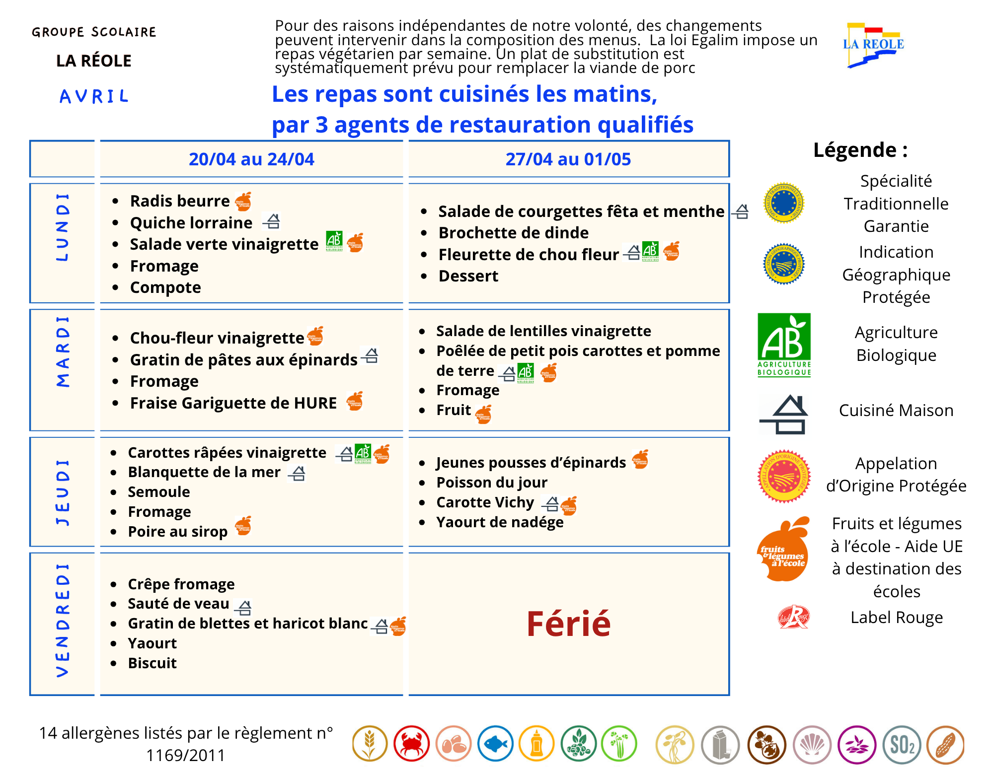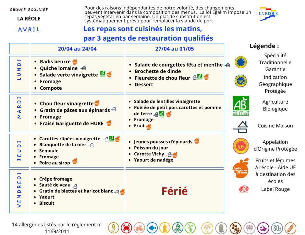 Depuis le mois de novembre 2018, le service « restauration scolaire » propose à vos enfants, une fois par semaine minimum un repas végétarien car la loi EGALIM n°2018–938 du 30 octobre 2018 le demande. Par conséquent et conformément aux dispositions règlementaires, ce repas peut être composé de protéines animales ou végétales (légumineuses, céréales, oléagineux, etc). Dans le cas du menu végétarien, ces protéines végétales peuvent être associées à des œufs et des produits laitiers.